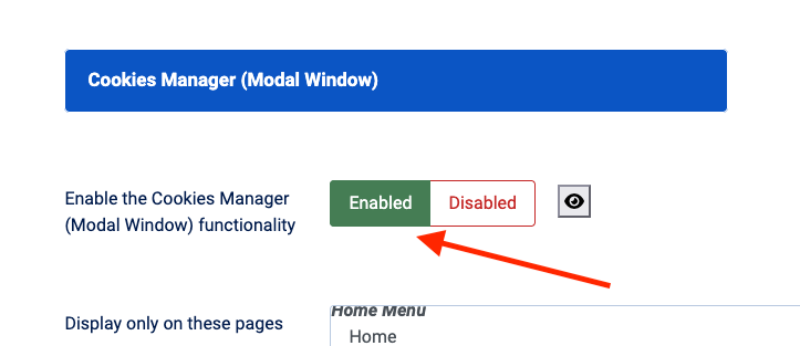 Prerequisite: Before creating the menu entry, you must enable the functionality in the plugin settings. Go to the Advanced Settings tab and ensure "Enable the Cookies Manager (Modal Window) functionality" is checked.