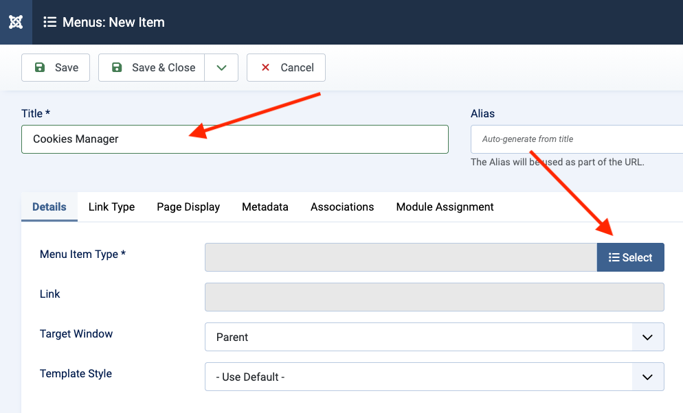 - Menu Item Type: Click the Select button.