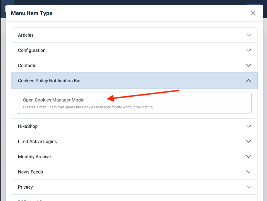 That's it! Visit your website's frontend. You should now see a new menu link that, when clicked, opens the Cookies Manager Modal for your visitors.